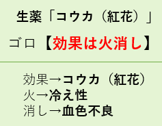 登録販売者・薬剤師試験対策に!生薬コウカ(紅花)の作用を覚えるゴロ(語呂)「効果は火消し」で、冷え性・血色不良改善のポイントを効率よく暗記。